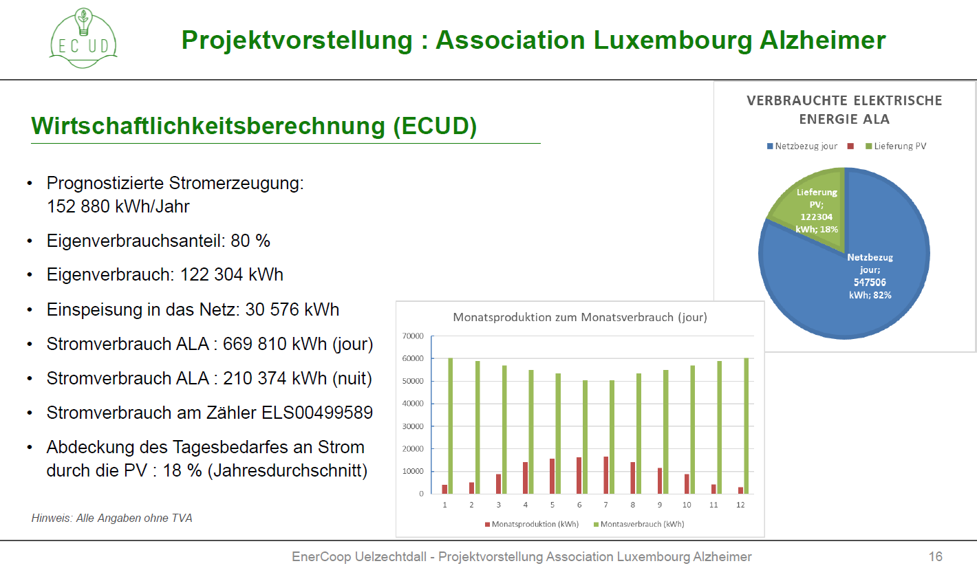 Sur les toits de la Maison de séjour et de soins« Beim Goldknapp » de l’ala, EnerCoop a pu installer 368 modules photovoltaïques. Ceux-ci produisent une puissance annuelle de 158 kWp, soit environ 153 MWh, ce qui correspond à la consommation moyenne de 47 ménages.